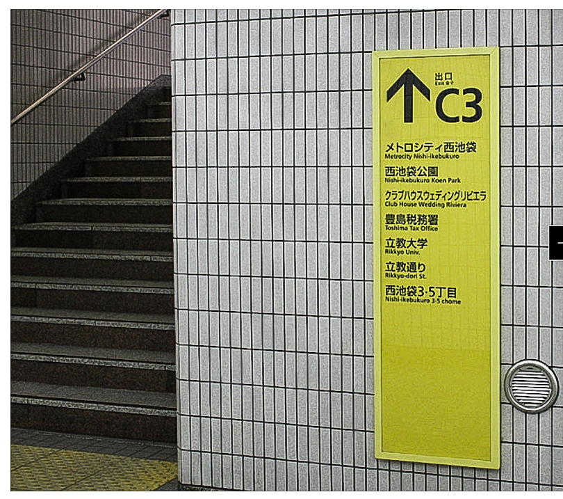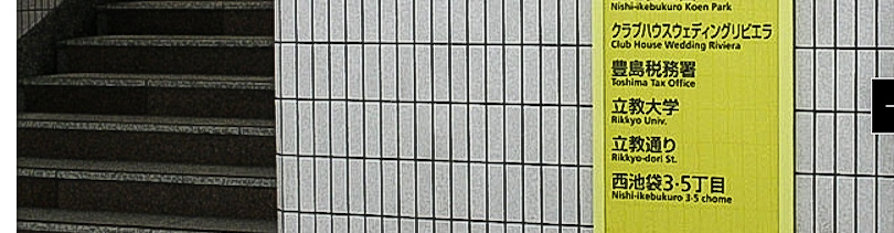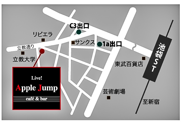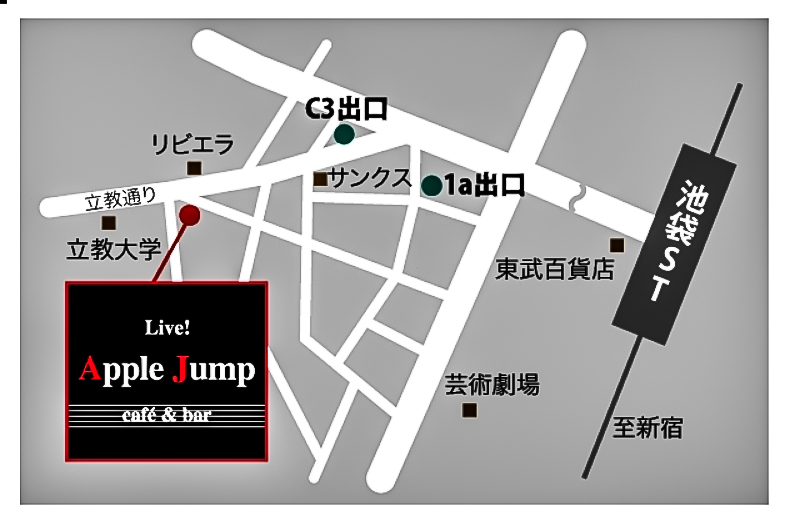 JR中央改札口を出て、地下街を東武百貨店のある西口方面へ向いますと、何度か、立教大学や地下鉄副都心線の看板が出てきます。それに沿って進みますと、立教通りに面する最寄のC3という出口に出ます。これを大学に向かって1分程歩くと、リビエラという大きな結婚式場がありまして、そのはす向かいのビルの地下となります。